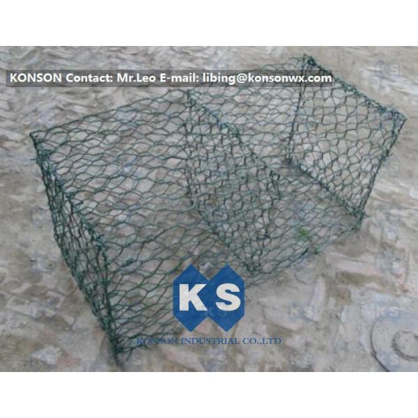 PVC coated galvanized gabion is the gabion which are woven by the hexagonal mesh, the diameter thickness depends on the mesh size, the diameter is between 2.0mm to 4.0mm if the material is zinc coated, while the diameter will be 3.0mm to 4.5mm if the material is PVC-coated wire, the selvage wire diameter usually is one gauge thicker than the body wire diameter.